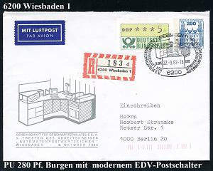 1326 | 16 € | 6200 Wiesbaden Sonder- und Hand-Werbestempel : 6200 WIESBADEN 1/ ..3.TREFFEN ARBEITSKREIS/ AUTOMATENPOSTWERTZEICHEN 1982 (27.9.) SSt = Schalter-Terminal auf motivgl. PU 280 Pf. Burgen (Mi.PU 124/2) + RZ: 6200 Wiesbaden 1/d (Nr.001) + rosa Linearcode, Inl.-R-Bf. (Bo.262) | ![]() | |