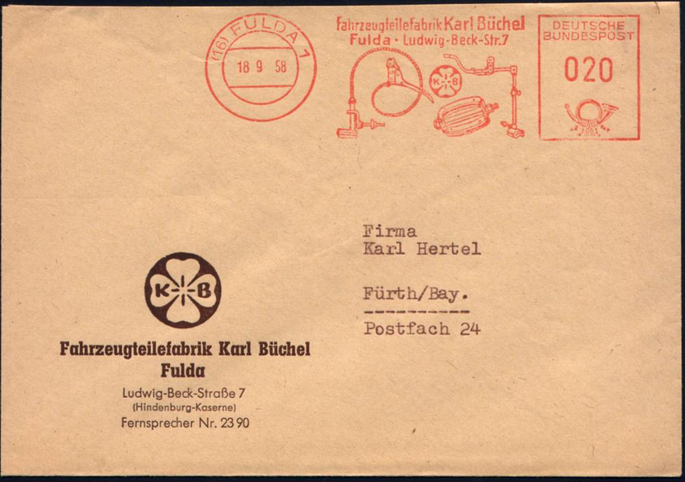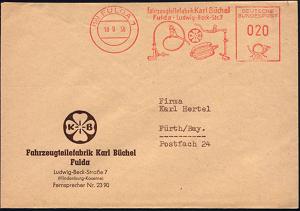 1986 | 18 € | 6400 Fulda Post- und Absender-Freistempel : (16) FULDA 1/ Fahrzeugteilefabrik Karl Büchel.. 1958 (18.9.) AFS Francotyp "Posthorn" (= Fahrrad-Bremse u. Fahrrad-Pedal etc.) Firmen-Bf., schöne u. seltene Motive! (Dü.E-23CO) | ![]() | |