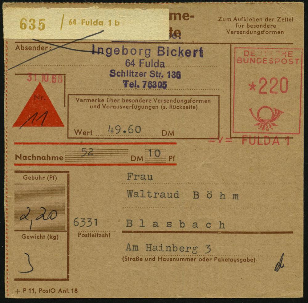 1990 | 14 € | 6400 Fulda Post- und Absender-Freistempel : FULDA 1=v= 1968 (Okt) Paket-PFS Francotyp *220 (Pf.) + brauner Paketzettel: 64 Fulda 1 b, Inl.-NN-Paketkarte n. Blasbach (Dü.H-6C) | ![]() | |