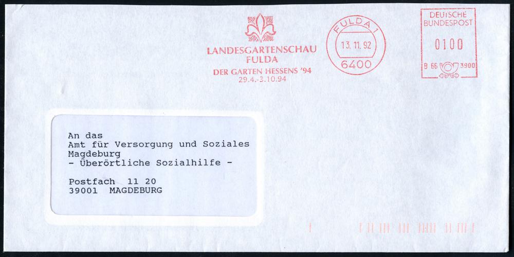1995 | 10 € | 6400 Fulda Post- und Absender-Freistempel : 6400 FULDA 1/ B66 3900/ LANDESGARTENSCHAU../ DER GARTEN HESSENS´94/ 29.4.-3.10.94 1992 (13.11.) AFS Postalia (stilis. Posthorn) mit Kennung (stlilis. Lilie) Kommunal-Bf. (Dü.E-26B) | ![]() | |