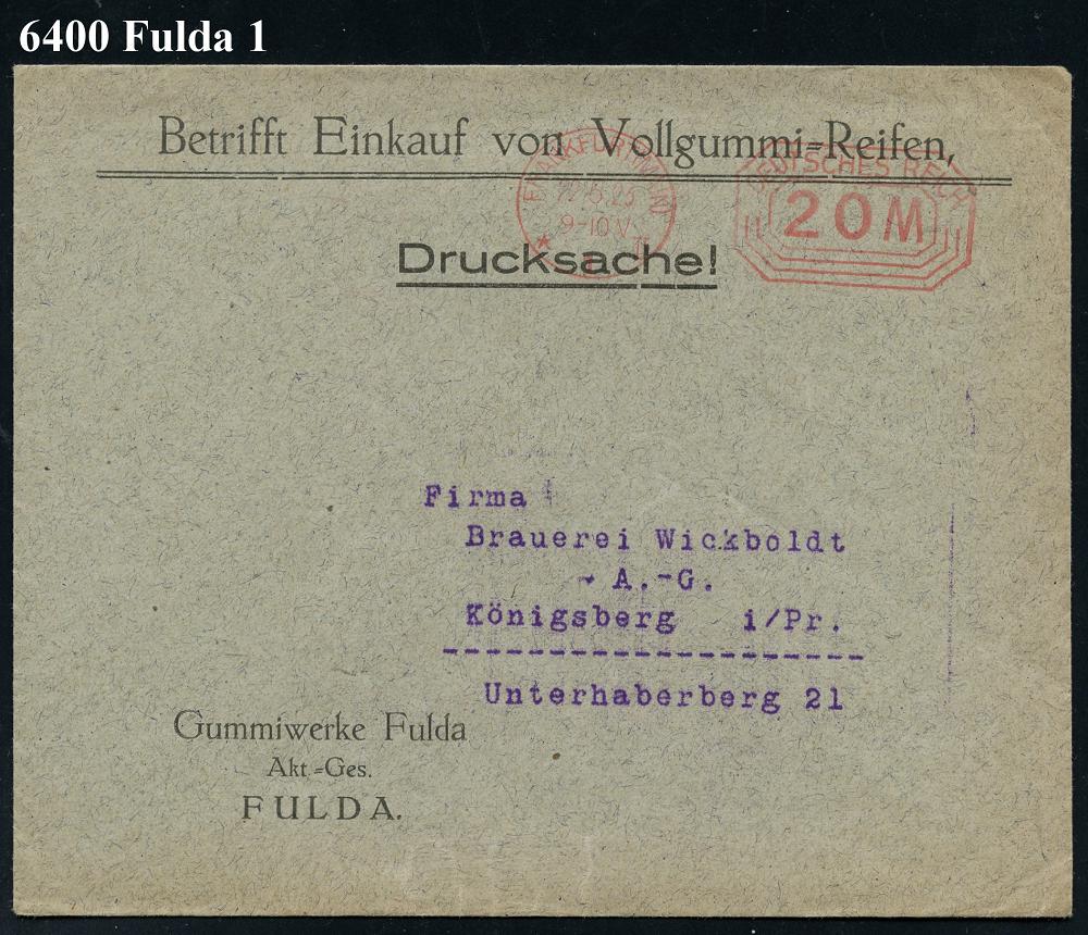 1965 | 25 € | 6400 Fulda Post- und Absender-Freistempel : Fulda 1923 (22.5.) Post-Freistempel: FRANKFURT (MAIN)/* 1 II/DEUTSCHES REICH 20 M(ark) auf Firmen-Bf.: Gummiwerke Fulda Akt.-Ges., FULDA, Betrifft Einkauf von Vollgummi-Reifen, Infla-Fern-Bf. n. Königsberg/Pr. (Dü.D-3, Nr.44) | ![]() ![]() | |