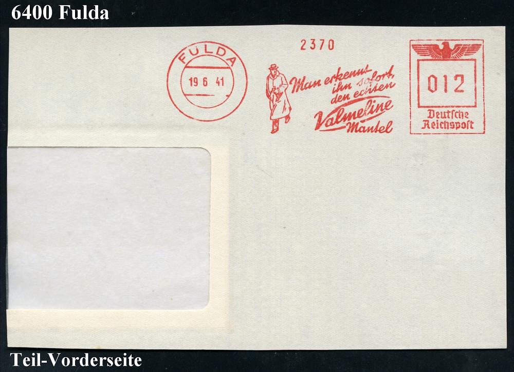 1972 | 16 € | 6400 Fulda Post- und Absender-Freistempel : FULDA/ Mann erkennt/ ihn sofort../ Valmeline/ Mäntel 1941 (19.6.) AFS Francotyp "Reichsadler" (Mann in Regenmantel u.Hut) Teil-Vorderseite, schönes Motiv! (E-5) | ![]() | |