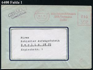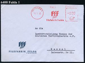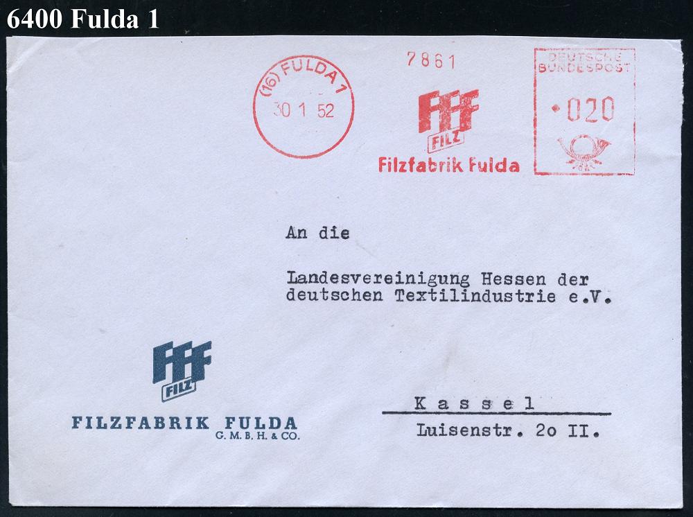 1984 | 15 € | 6400 Fulda Post- und Absender-Freistempel : (16) FULDA1/ FFF/ FILZ/ Filzfabrik Fulda 1952 (30.1.) AFS Francotyp "Posthorn" (Monogr.-Logo) motivgl. Firmen-Bf. (Dü.E-23DGh) | ![]() | |