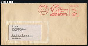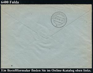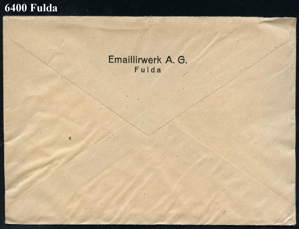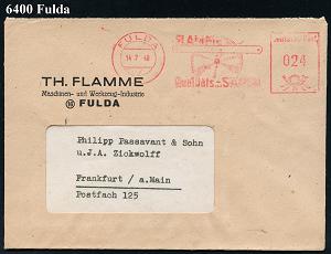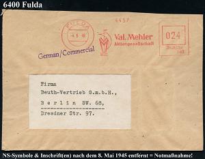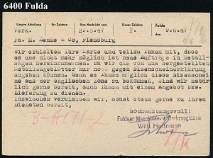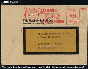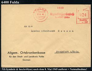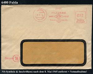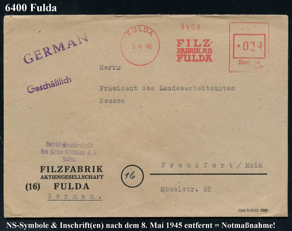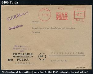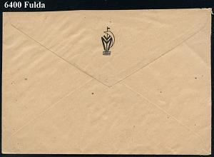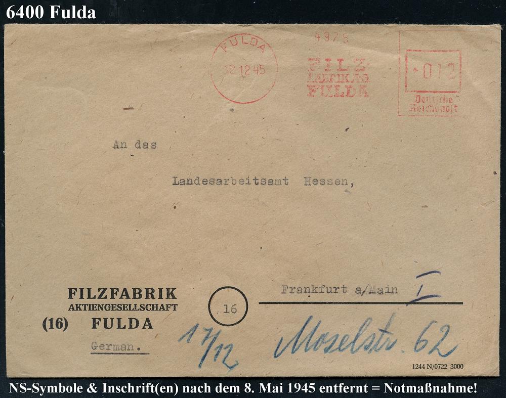 1973 | 28 € | 6400 Fulda Post- und Absender-Freistempel : FULDA/ FILZ/ FABRIK AG/ FULDA 1945 (12.12.) seltener, aptierter AFS Francotyp "Reichsadler" = entfernt, Inschrift "Deutsche Reichspost" unverändert = Notmaßnahme! , Firmen-Bf. n. Ffm., vergl. Nr.1975 (Dü.E-13 J.147h, nur wenige Monate verwendet!) | ![]() | |