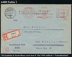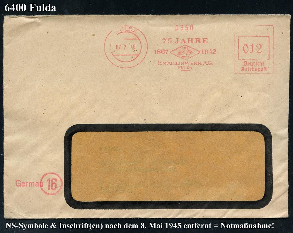 1974 | 25 € | 6400 Fulda Post- und Absender-Freistempel : FULDA/ 75 JAHRE/ 1807 1942/ EMALLIERWERKE AG.. 1946 (7.2.) aptierter AFS Francotyp "Reichsadler" = entfernt + Inschrift "Deutsche Reichspost" = Notmaßnahme! (Firmen-Logo: 2 Pyramiden) im Ort gering undeutl., rs. Abs.-Vordruck, Fern-Bf., vergl. Nr.1977 (Dü.E-13 J-127h) | ![]() ![]() | |