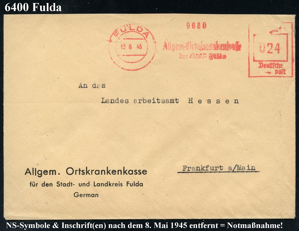 1978 | 23 € | 6400 Fulda Post- und Absender-Freistempel : FULDA/ Allgem.Ortskrankenkasse/ der Stadt Fulda 1946 (!§:&:) APTIERTER AFS Francotyp "Reichsadler" = entfernt + "Reichs" = Notmaßnahme! , Fern-Bf. n. Ffm. (Dü.E.13 Y-129h) | ![]() | |