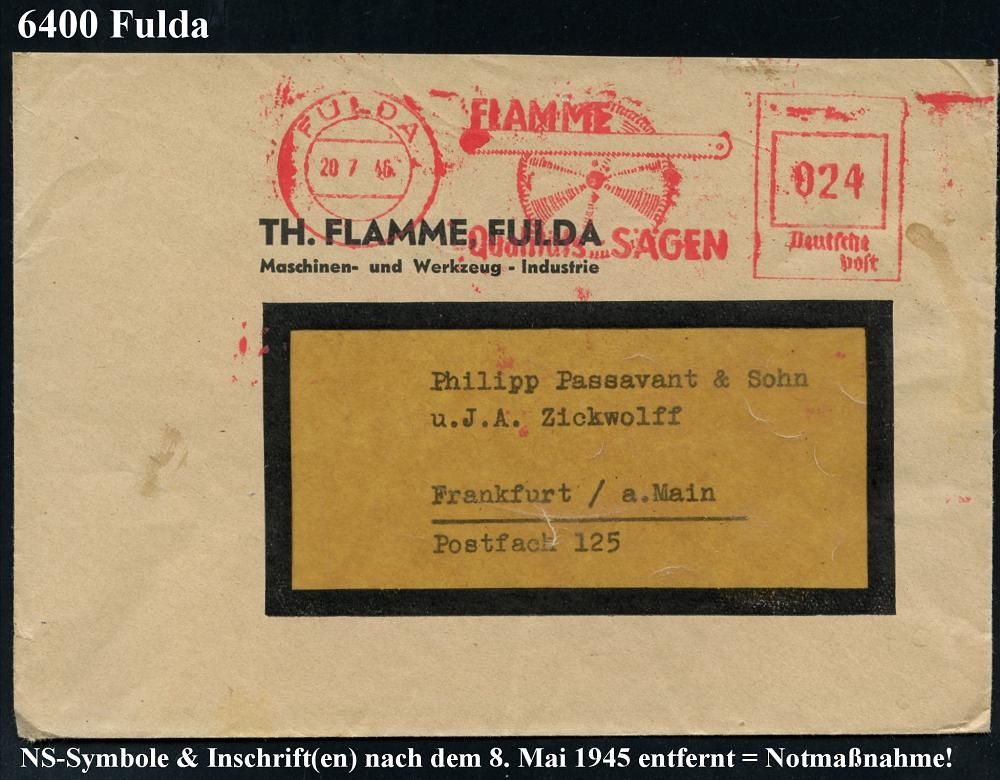 1979 | 25 € | 6400 Fulda Post- und Absender-Freistempel : FULDA/ FLAMME/ Qualitäts-SÄGEN 1946 (20.7.) aptierter AFS Francotyp "Reichsadler" = entfernt + "Reichs" = Notmaßnahme! (2 Sägeblätter) Firmen-Bf.: TH. FLAMME, Maschinen- u. Werkzeug-Industrie (Dü.E-13 Y-129o) | ![]() | |