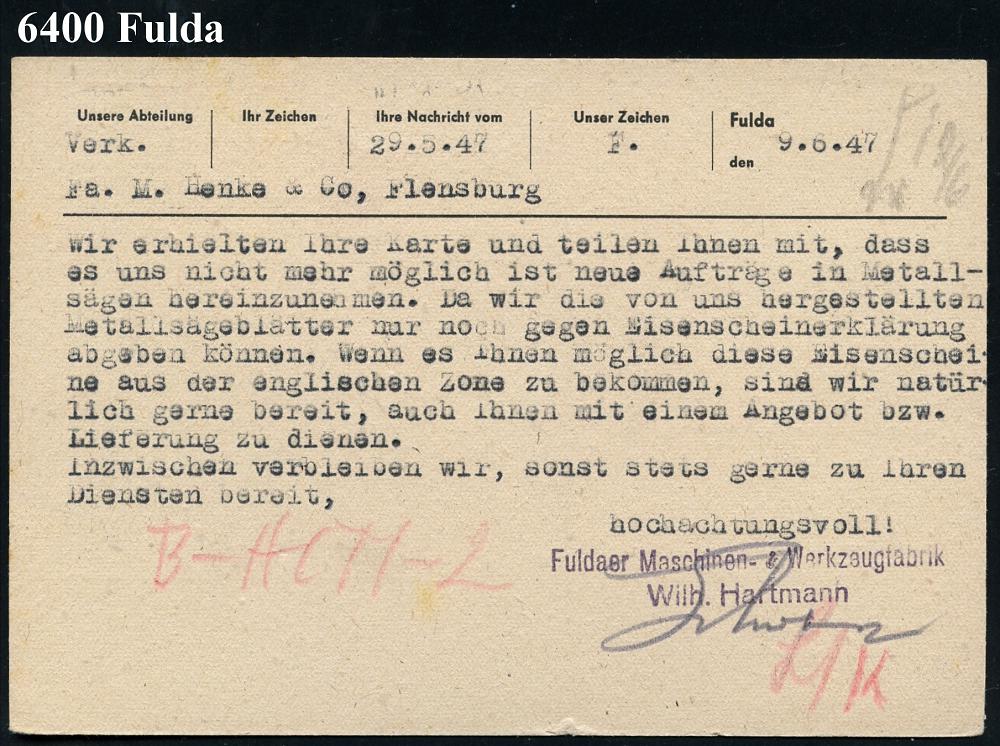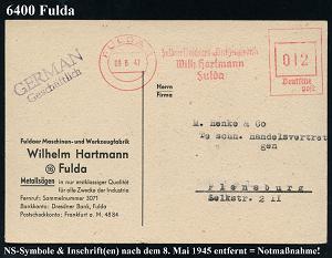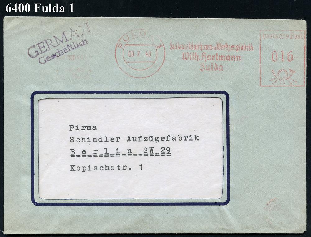1980 | 25 € | 6400 Fulda Post- und Absender-Freistempel : FULDA 1/ Fuldaer Maschinen-u.Werkzeugfabrik/ Wilh.Hartmann.. 1947 (9.7.) aptierter AFS Francotyp "Reichsadler" = entfernt + "Reichs" = Notmaßnahme! , Firmen-Kt. n. Flensburg, vergl. Nr.1981 (Dü.E-13 Y-129o) | ![]() ![]() | |
