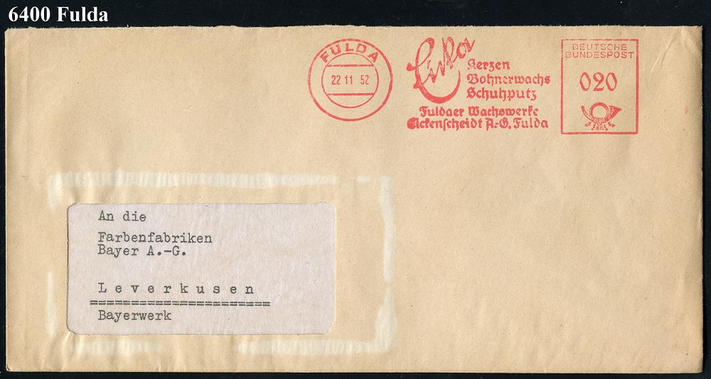 1983 | 15 € | 6400 Fulda Post- und Absender-Freistempel : FULDA/ Eicka/ Kerzen/ Bohnerwachs/ Schuhputz/ Fuldaer Wachswerke/ Eickenscheidt AG.. 1952 (22.11.) AFS Francotyp "Posthorn" (Sütterlin-Schriftzug) Fern-Bf. (Dü.E-23CEo) | ![]() | |