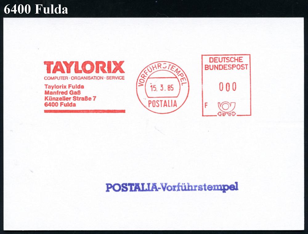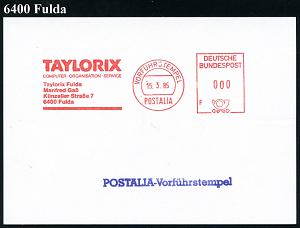 1994 | 15 € | 6400 Fulda Post- und Absender-Freistempel : 6400 Fulda 1985 (15.3.) AFS.: VORFÜHRSTEMPEL/POSTALIA/TAYLORIX/COMPUTER - ORGANISATION - SERVICE.. , Postalia-Musterkarte | ![]() | |