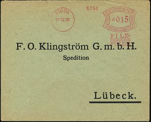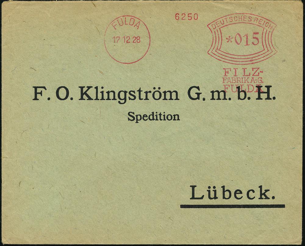 1967 | 22 € | 6400 Fulda Post- und Absender-Freistempel : FULDA/ FILZ=/ FABRIK AG. 1928 (17.12.) AFS Francotyp "Bogenrechteck" klar auf Firmen-Fern-Bf. n. Lübeck, vergl. Nr. 1966 (Dü.E-1Ah) | ![]() ![]() | |