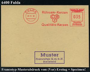 1969 | 35 € | 6400 Fulda Post- und Absender-Freistempel : FULDA/ Rübsam-Kerzen/ CRF/ Qualitäts-Kerzen 1938 (24.11) AFS-Musterabdruck "Reichsadler" (3 Bienenwaben) glasklar gest. Francoty-Musterblatt vom (Vor)-Ersttag!, selten! (Dü.E-5CG) | ![]() ![]() | |