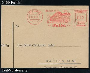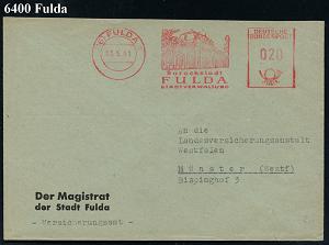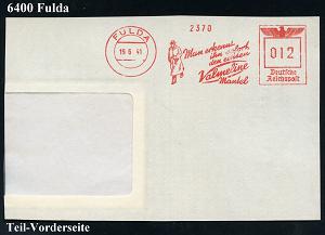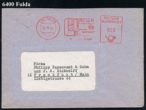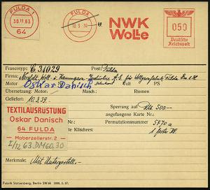 1970 | 60 € | 6400 Fulda Post- und Absender-Freistempel : FULDA/ NWK/ WOLLE 1939 (10.3.) AFS 050 Pf. Francotyp "Reichsadler" auf Archivkarte + hs. Maschinen-Nr. "C. 31029" u.a. Daten + zusaätzliches Klischee + Stempel mit neuer PLZ 64 FULDA 1 (von 1963), seltenes U n i k a t ! (Dü.E-5CGo) | ![]() ![]() | |