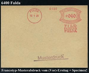 1966 | 38 € | 6400 Fulda Post- und Absender-Freistempel : FULDA/ FILZ=/ FABRIK AG. 1928 (16.1.) AFS-Musterabdruck Francotyp "Bogenrechteck" , glasklar gest. Francotyp-Musterblatt vom (Vor)-Ersttag!, selten!, vergl. Nr.1967 (Dü.E-1Ah) | ![]() ![]() | |