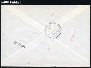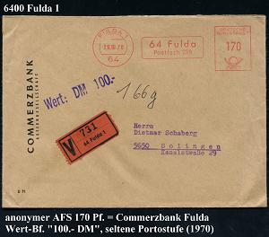 1991 | 25 € | 6400 Fulda Post- und Absender-Freistempel : 64 FULDA 1/ 64 Fulda/ Postfach 228 1970 (29.10.) anonymisierter AFS Francotyo "Posthorn" 170 Pf. + roter Wertzettel: 64 Fulda 1 , Firmen-Bf.: COMMERZBANK AG, Inl.-Wert-Bf. "100.- DM" n. Solingen, seltene Portostufe! (Dü.E-23CO) | ![]() | |