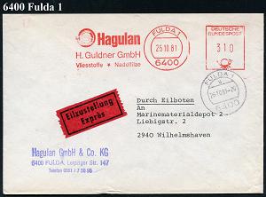 1993 | 20 € | 6400 Fulda Post- und Absender-Freistempel : 6400 FULDA 1/ Hagulan/ H.Guldner GmbH/ Vliesstoffe*Nadelfilze 1981 (26.10.) AFS Stielow-Neopost "Posthorn" 310 Pf. (Monogr.-Logo) Fern-Eil-Bf. n. Wilhelmshaven, rs. div. Eil- u. AS. seltene Portostufe! (Dü.E-26G = seltene Type) | ![]() ![]() | |