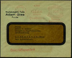 1968 | 20 € | 6400 Fulda Post- und Absender-Freistempel : FULDA/ Gies/ bürgt für/ Qualität/ Kerzen/ Bohnerwachs 1934 (13.11.) AFS Francotyp "Bogenrechteck" (C-Maschine!) auf Firmen-Bf.: Wachsindustrie Fulda, Adam Gies.. (Dü.E-1CEh) | ![]() ![]() | |