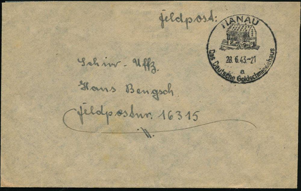 2092 | 16 € | 6450 Hanau Allgem. Belege : HANAU/ a/ Das Deutsche Golschmiedehaus 1943 (28.6.) HWSt = Goldschmiede-Museum , klar gest. Feldpost-Bf. an Fp.-Nr. 16315 = Eisenbahn-Bau-Komp. 106 (Bo.11 , Type II , nur 1943-44 verwendet) | ![]() | |