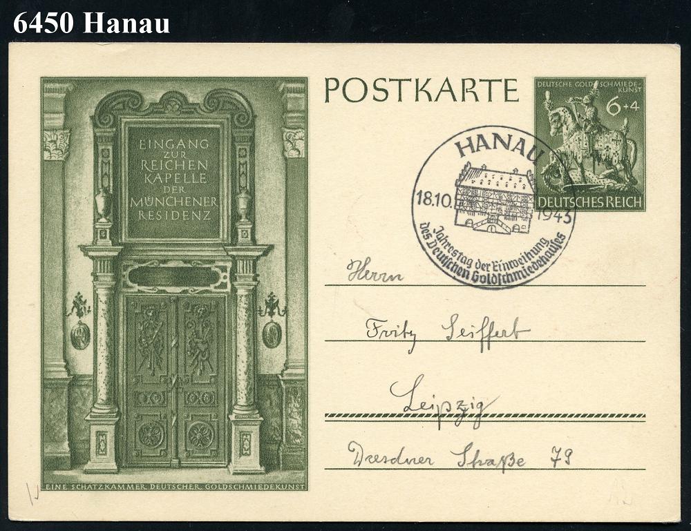 2094 | 14 € | 6450 Hanau Allgem. Belege : HANAU/ Jahrestag der Einweihung/ des Deutschen Goldschmiedehauses 1943 (18.10.) SSt = Goldschmiedehaus auf passender Sonder-P. 6 + 4 Pf. Goldschmiedekunst (Mi.P 296 = St. Georg als Ritter) klar gest. Inl.-Karte (Bo.12, nur am 18.10.) | ![]() | |