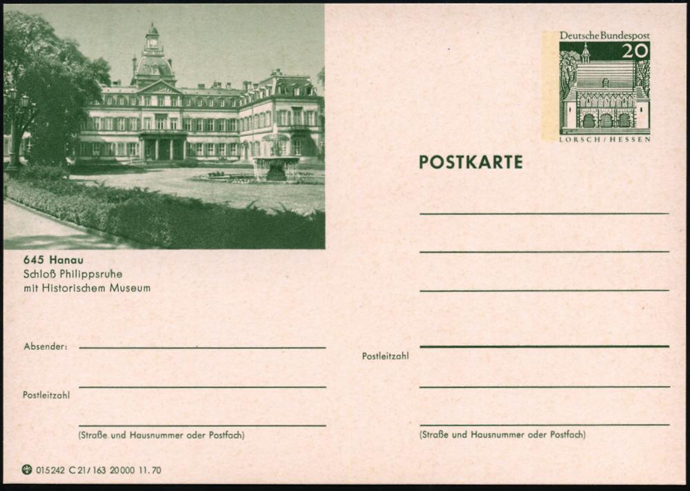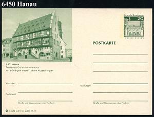 2099 | 6 € | 6450 Hanau Allgem. Belege : 645 Hanau 1970 20 Pf. BiP Lorsch, grün: Deutsches Goldschmiedehaus , ungebr. (Mi.P 99/C 21-164) | ![]() | |