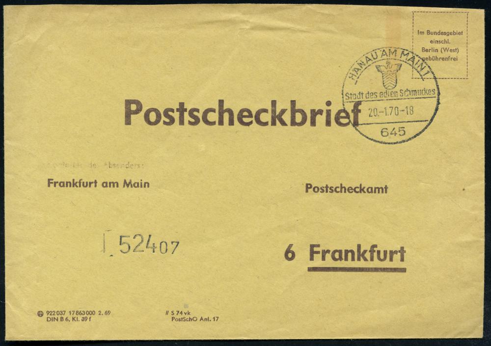 2100 | 15 € | 6450 Hanau Allgem. Belege : 645 HANAU AM MAIN 1/ Stadt desedlen Schmuckes 1970 (20.1.) HWSt (Stadtwappen) portofreier, gelber PSch-Bf.! = seltene Verwendung! (Bo.22) | ![]() | |