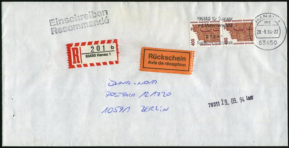 2106 | 15 € | 6450 Hanau Allgem. Belege : 63450 HANAU 1/ mc/ HANAU für Toleranz/ u.Menschenwürde.. 1994 (28.9.) MWSt auf 400 Pf. Staatsoper Dresden + RZ: 63450 Hanau 1/b (neue PLZ, Naßklebezettel), Inl.-R-Bf. "Rückschein" (Mi.1562 MeF, + 10.- EUR) | ![]() | |