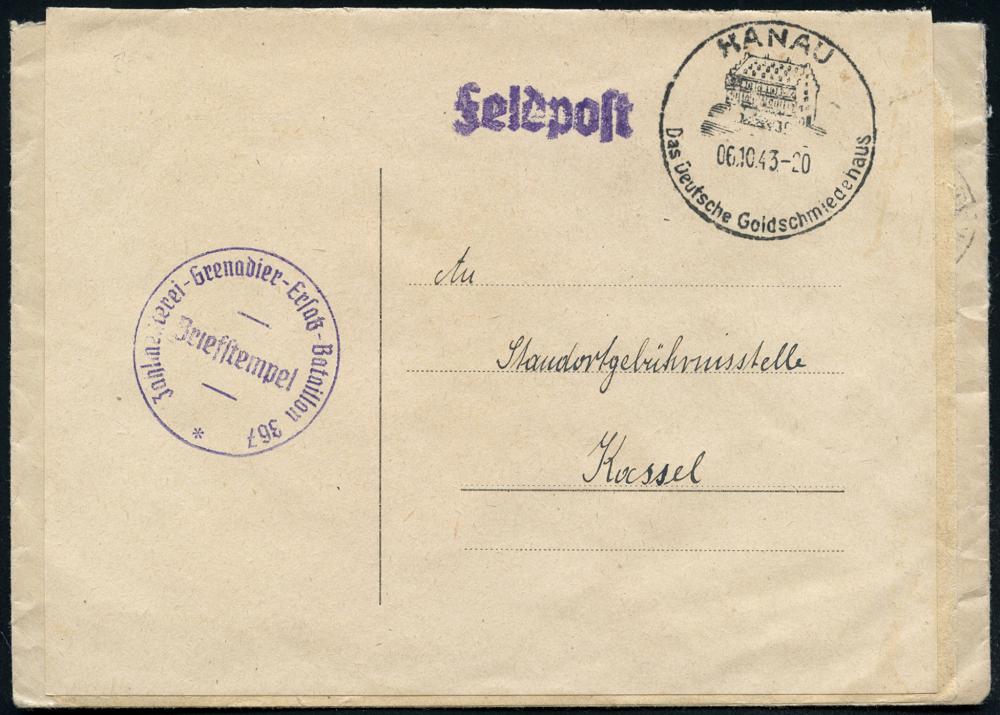 2093 | 18 € | 6450 Hanau Allgem. Belege : HANAU/ Das Deutsche Goldschmiedehaus 1943 (6.10) HWSt = Deutsches Goldschmiedehaus + 1K-HdN: Zahl-meisterei Grenadier-Ersatz-Bataillon 367 , klar gest. Feldpost-Bf. n. Kassel (Bo.11 , Type I, nur 1943-44 verwendet) | ![]() ![]() | |