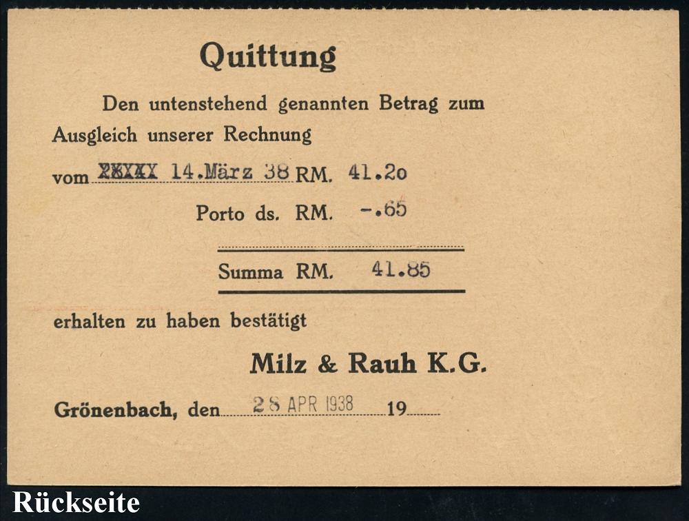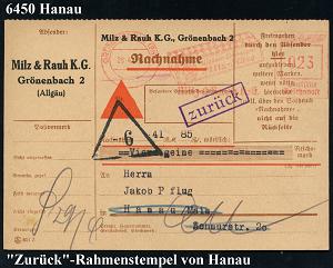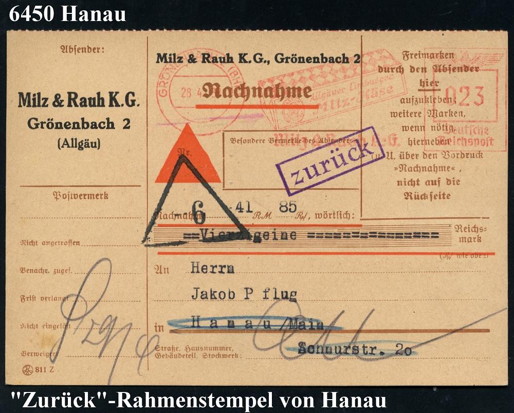 2089 | 20 € | 6450 Hanau Allgem. Belege : Hanau am Main 1938 (28.4.) viol. Ra.: zurück = Retourstempel u. Nachnahme-Dreieck-Stpl. von Hanau auf Retour-NN-Kt. aus Bayern, AFS.: GRÖNENBACH 2 (BHF)/Milz & Rauh KG.. (Käsepackung) 23 Pf. Porto | ![]() ![]() | |