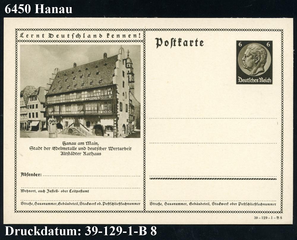 2090 | 10 € | 6450 Hanau Allgem. Belege : Hanau am Main 1939 6 Pf. BiP Hindenbg., braun: Stadt der Edelmetalle = Goldschmiedehaus (Rathaus) ungebr. (Mi.P 236/39-129-1-B 8) | ![]() | |