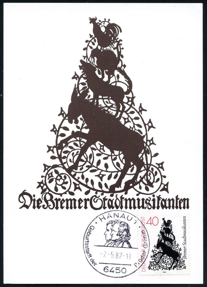 2103 | 8 € | 6450 Hanau Allgem. Belege : 6450 HANAU 1/ Geburtsstadt der Brüder Grimm 1982 (7.5.) SSt = Köpfe der Gebr. Grimm auf 40 Pf. "Bremer Stadtmusikanten" (Mi.1120) Maximum-Kt. (Bo.40) | ![]() | |