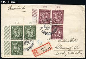 2095 | 23 € | 6450 Hanau Allgem. Belege : HANAU/ Jahrestag d.Einweihung/ des Deutschen Goldschmiedemuseums 1943 (18.10.) SSt auf kompl. Satz Golschmiedekunst in Eckrand-3er-Blocks = Ritter St.Georg + RZ: Hanau 1/bb (Bf. unsichtbare Mittelfalte) sauber gest. Inl.-R-Bf. (Mi.3x 860/61) | ![]() | |