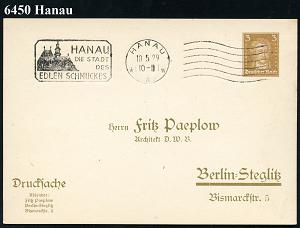 2085 | 18 € | 6450 Hanau Allgem. Belege : HANAU/ *Aw/ DIE STADT/ DES/ EDLEN SCHMUCKES 1929 (10.5.) MWSt (Rathaus) + 6 Wellen rechts auf PP 3 Pf. Goethe, braun: Fritz Paeplow (Mi.PP 97/B 6) klar gest.! (Bo.7 C , Erstjahr) | ![]() | |