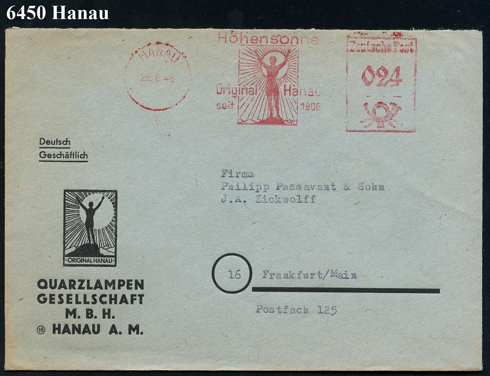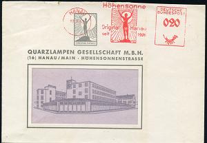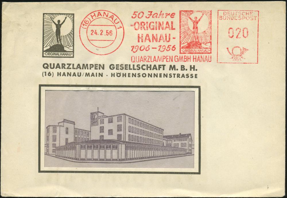 2122 | 20 € | 6450 Hanau Post- und Absender-Freistempel : (16) HANAU 1/ 50 Jahre/ ORIGINAL/ HANAU/ 1906-1956/ QUARZLAMPEN GMBH 1956 (24.2.) seltener Jubil.-AFS (Mensch auf Berg grüßt aufgehende Sonne) motivgl. Reklame-Bf. + Werks-Abb.!, vergl. vorgerige Belege (Dü.E-23CO) | ![]() | |