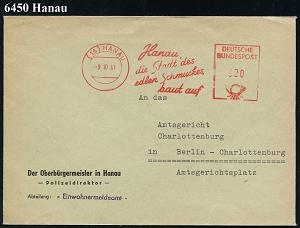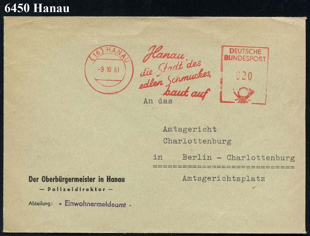 2125 | 12 € | 6450 Hanau Post- und Absender-Freistempel : (16) HANAU/ d.Stadt des/ edlen Schmuckes/ baut auf 1961 (9.10.) AFS Postalia "Posthorn" auf Dienst-Bf.: Der Oberbürgermeister - Polizeidirektor - Einwohnermeldeamt | ![]() | |