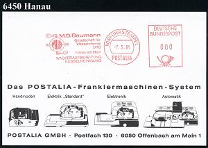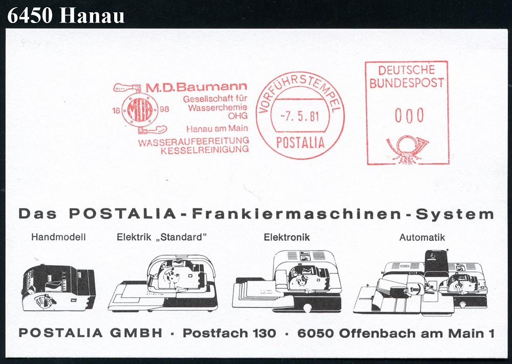 2130 | 18 € | 6450 Hanau Post- und Absender-Freistempel : Hanau 1981 (7.5.) AFS: VORFÜHRSTEMPEL/POSTALIA/M.D.Baumann/..WASSERAUFBEREITUNG/KESSELREINIGUNG (Ventil), seltene Postalia Musterkt.! (= Specimen!) | ![]() | |