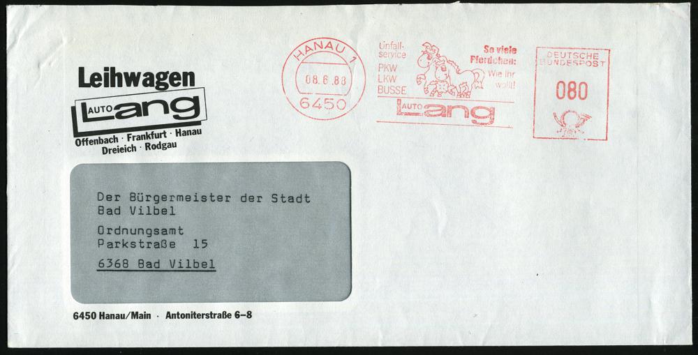 2131 | 10 € | 6450 Hanau Post- und Absender-Freistempel : 6450 HANAU 1/ Unfall-/ service/ PKW/ LKW/ BUSSE/ So viele/ Pferdchen:/ Wie Ihr/ wollt!/ AUTO Lang 1988 (8.6.) AFS Francotyp = 2 Pferde (m. Glücksklee) Firmen-Bf.: Leihwagen AUTO Lang.. (Dü.E-23CO) | ![]() | |