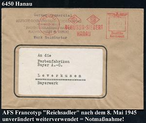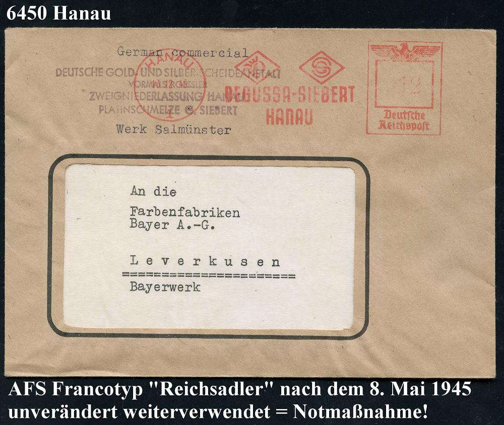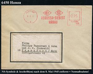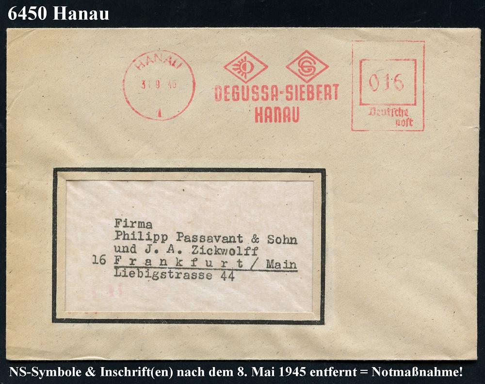 2113 | 45 € | 6450 Hanau Post- und Absender-Freistempel : HANAU/ 1/ DEGUSSA-SIEBERT/ HANAU 1945 (13.12.) AFS Francotyp "Reichsadler" u n v e r ä n d e r t weiterverwendet = Notmaßnahme! (Firmen-Logo Degussa u. Siebert) Abs.-3L: DEUTSCHE GOLD- U. SILBERSCHEIDEANSTALT.. PLATINSCHMELZE SIEBERT, die Firma war in den Holocaust verwickelt und stand unter alliierter Kontrolle!, + Zusatz Werk Salmünster, seltener Fern-Bf., vergl. Nr.2114-15, 2117 (Dü.E-5CGo, unverändert, nur kurze Zeit!) | ![]() | |