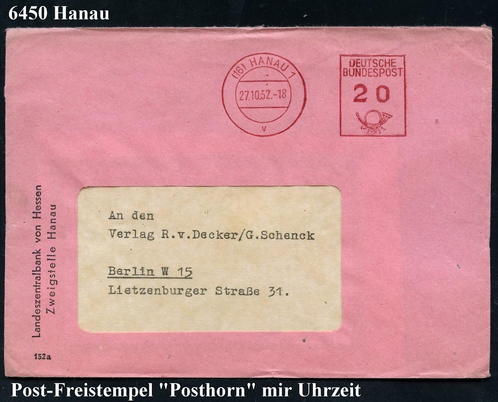 2119 | 8 € | 6450 Hanau Post- und Absender-Freistempel : (16) HANAU 1/ v/ DEUTSCHE/ BUNDESPOST 1952 (27.10.) PFS 20 Pf. "Posthorn" auf Dienst-Bf.: Landeszentralbank von Hessen, Zweigstelle Hanau (Dü.D-17) | ![]() | |