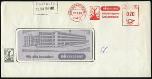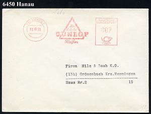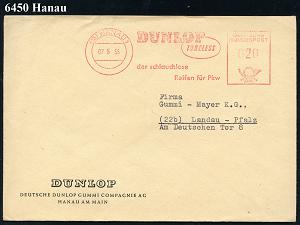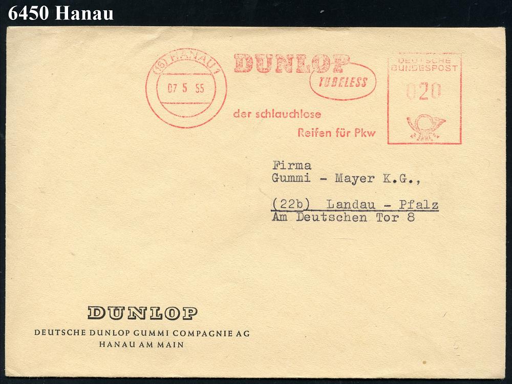 2121 | 18 € | 6450 Hanau Post- und Absender-Freistempel : (16) HANAU 1/ DUNLOP.. 1955/56 2 verschiedene AFS Francotyp "Posthorn" , 2 Firme-Briefe: DEUTSCHE DUNLOP GUMMI COMPAGNIE AG.., 2 Belege (Dü.E-23CG, E.23CO) | ![]() ![]() | |