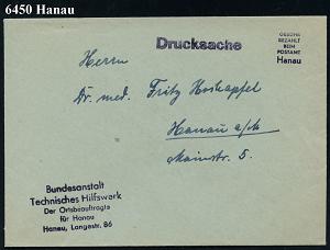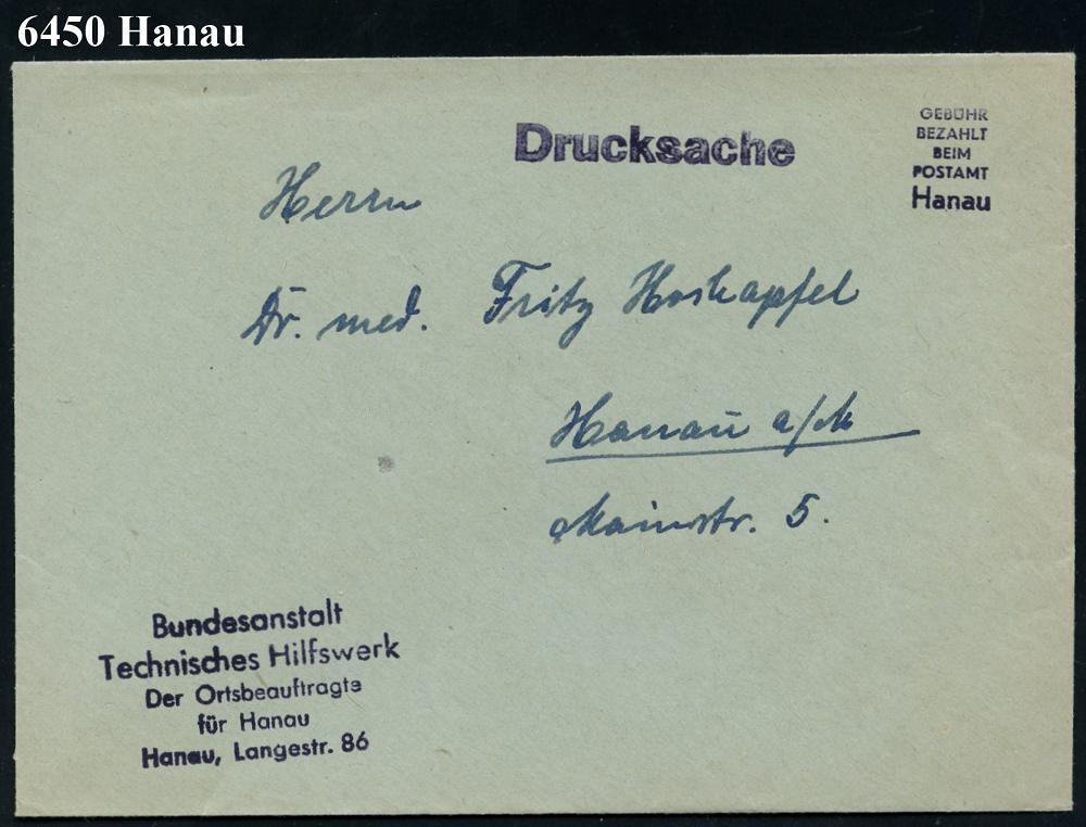 2123 | 15 € | 6450 Hanau Post- und Absender-Freistempel : Hanau 1955 (ca.) viol. 5L: GEBÜHR/BEZAHLT/BEIM/POSTAMT/Hanau + Abs-5L: Bundesanstalt/Techn.Hilfswerk/Der Ortsbeauftragte.. , Inl.-Drs. | ![]() | |