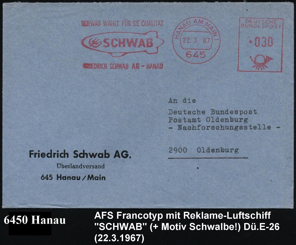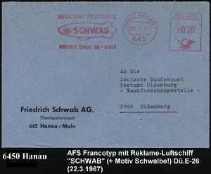 2128 | 10 € | 6450 Hanau Post- und Absender-Freistempel : 645 HANAU AM MAIN 1/ ..FRIEDRICH SCHWAB AG 1967 AFS Francotyp "Posthorn" (Schwab-Luftschiff, Schwalben-Motiv) klar auf Firmen-Bf.: Friedr. Schwab AG Überlandversand (Dü.E-26) | ![]() | |