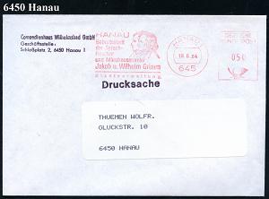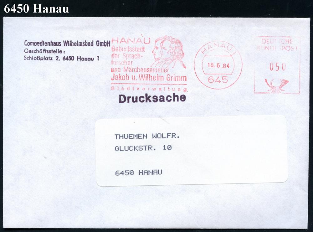 2132 | 10 € | 6450 Hanau Post- und Absender-Freistempel : 645 HANAU 1/ Geburtsstadt/ d.Sprach-/ forscher/ u.Märchensammler/ Jakob u.Wilh.Grimm/ Stadt-verwaltung 1982 (18.6.) AFS Postalia (Köpfe Gebr. Grimm) Abs.-3L: Comoedienhaus Wilhelmsbad GmbH.., Kommunal-Bf. (Dü.E-26B) | ![]() | |
