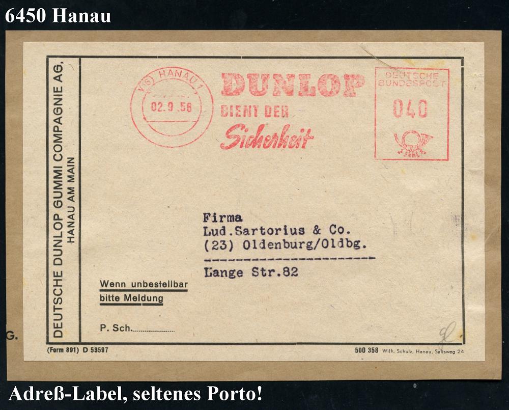 2124 | 16 € | 6450 Hanau Post- und Absender-Freistempel : (16) HANAU 1/ DUNLOP/ DIENT DER/ SICHERHEIT 1958 (2.9.) AFS Francotyp "Posthorn" 040 Pf. auf Adreß-Aufkleber: DEUTSCHE DUNLOP GUMMI COMPAGNIE AG.. (Dü.E-23CO) | ![]() | |