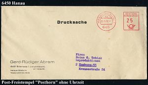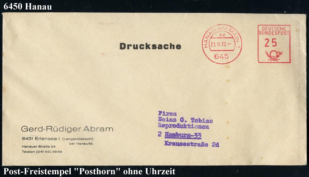 2129 | 10 € | 6450 Hanau Post- und Absender-Freistempel : 645 HANAU AM MAIN 1/ sa/ DEUTSCHE/ BUNDESPOST 1972 (21.11.) PFS 25 Pf. "Posthorn" ohne Uhrzeit , Abs.-Vordruck: Gerd-Rüdiger Abram, 6451 Erlensee.. (Dü.D-17) | ![]() | |