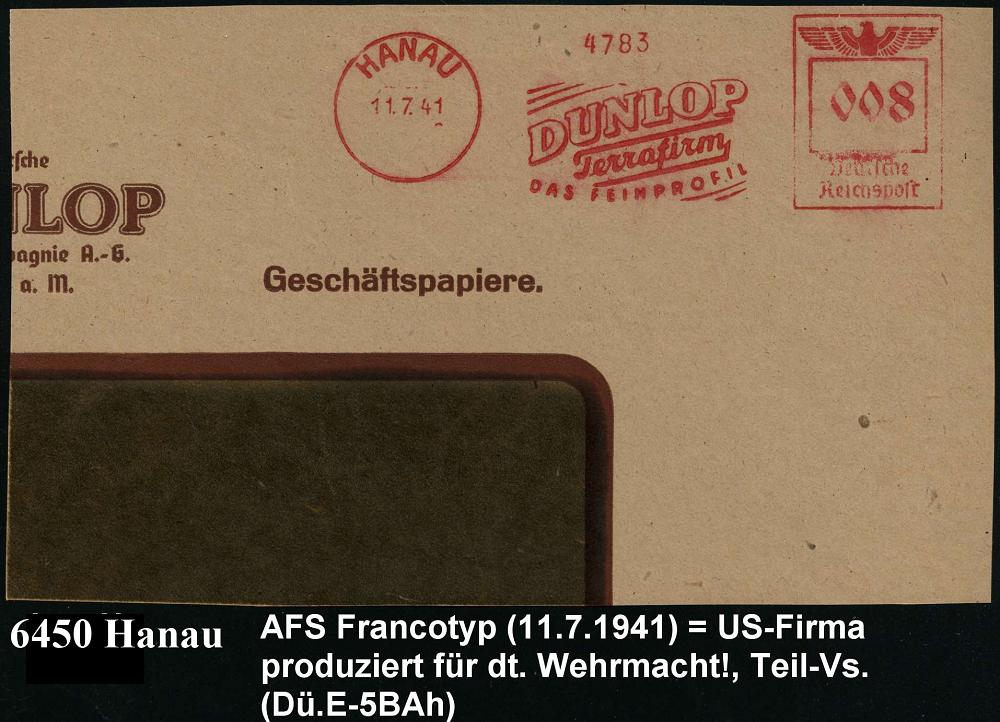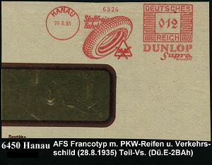 2110 | 28 € | 6450 Hanau Post- und Absender-Freistempel : HANAU/ DUNLOP.. 1935/41 3 verschiedene AFS Francotyp "Mäanderrechteck" bzw. "Reichsadler" , 1x Reifen- bzw. Verkehrsschild-Motiv (2 Varianten), 3 klar gest. Teil-Vorderseiten, 3 Belege (Dü.E-2BAh, E-5BAh) | ![]() ![]() ![]() | |