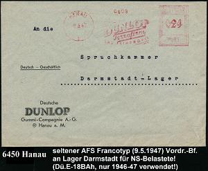 2116 | 23 € | 6450 Hanau Post- und Absender-Freistempel : HANAU/ 1/ DUNLOP/ Terrafirm/ DAS FEINPROFIL 1947 (9.5.) seltener AFS-Typ Francotyp "Hochrechteck" auf Firmen-Bf: Deutsche Dunlop Gummi-Compagnie AG. (rs.Abs: Betriebsrat) an die Entnazifizierungs-Spruchkammer Darmstadt Lager = Lager für NS-Belastete, seltener Beleg! (Dü.E-18 BAh, nur ca. 1 1/2 Jahre verwendet) | ![]() | |