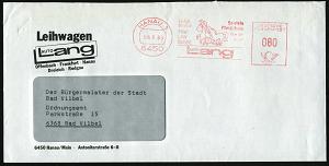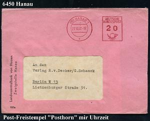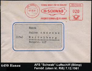 2126 | 14 € | 6450 Hanau Post- und Absender-Freistempel : (16) HANAU 1/ ..SCHWAB/ FRIEDRICH SCHWAB & CO.. 1961 (7.12.) AFS Francotyp "Posthorn" mit alter PLZ (Schwab-Luftschiff) Fern-Bf. (Dü.E-23CO) | ![]() | |