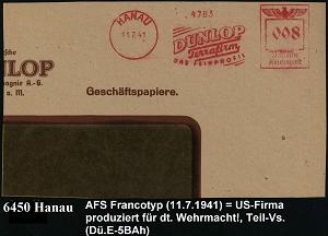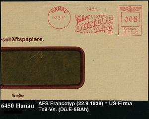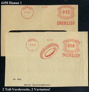 2108 | 20 € | 6450 Hanau Post- und Absender-Freistempel : HANAU #bzw.# HANAU 1/ DUNLOP 1931/32 2 verschiedene AFS Francotyp "Bogenrechteck" (1x PKW-Reifen) 2 Teil-Vorderseiten (1x kl. Rißchen geschl.) 2 Belege (Dü.E-1BAh) | ![]() | |