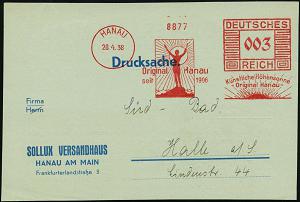 2111 | 18 € | 6450 Hanau Post- und Absender-Freistempel : HANAU/ Original Hanau/ seit 1906/ Künstliche Höhensonne.. 1938 (28.4.) dekorativer AFS Francotyp "Mäanderrechteck"= Mensch vor Sonne (+ aufgehende Sonne) Firmen-Vorderseite: SOLLUX VERSANDHAUS (Dü.E-2BAh) | ![]() | |