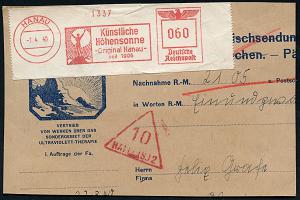 2112 | 25 € | 6450 Hanau Post- und Absender-Freistempel : HANAU/ Künstliche Höhensonne/ "Original Hanau"/ seit 1906 1940 (1.4.) AFS Francotyp "Reichsadler" 060 Pf. (= Mann begrüßt auf Berg die aufgehende Sonne) auf motiv-ähnl. Reklame-Teil-Vorderseite: NN-Päckchen, seltene Portostufe! (Dü.E-5CGh) | ![]() | |